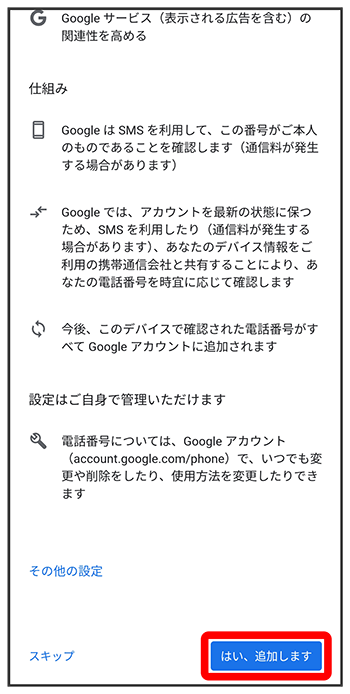 - セキュリティ保護目的でのみ電話番号を追加するときは、をタップします。以降は画面の指示に従って操作してください。