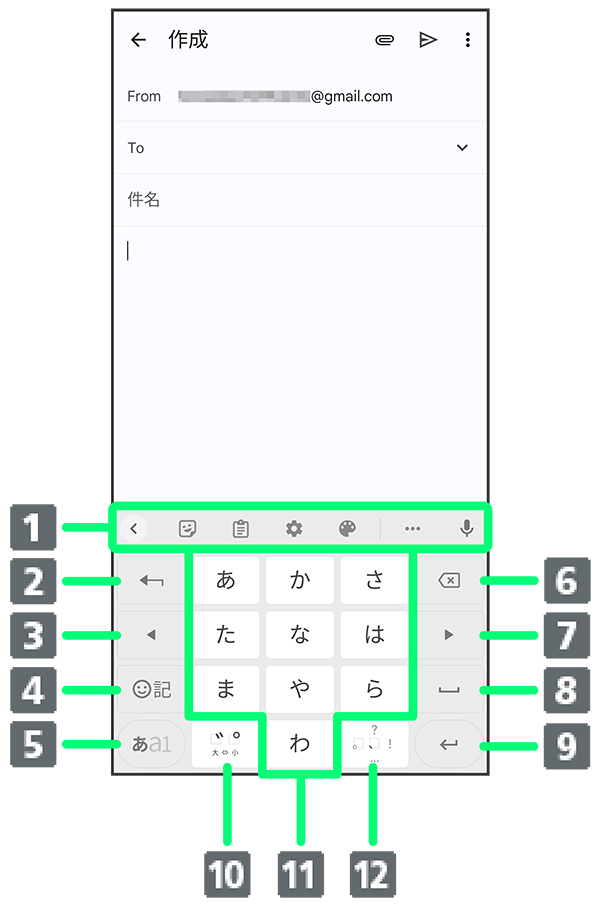 - 文字入力モードを切り替えます(ひらがな/半角英字/数字)。ロングタッチすると入力オプションが表示されます。