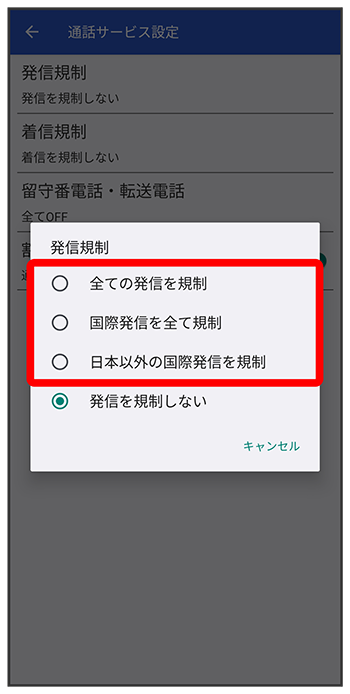 - 発着信規制中に電話やSMSを発信しようとすると、発信できない旨のメッセージが表示されます。お客様がご利用になる地域によっては、表示されるまでに時間がかかることがあります。