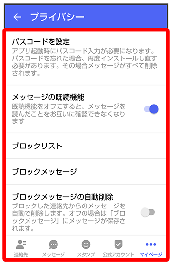 | ブロックメッセージの自動削除 | ブロックした連絡先からのメッセージを自動で削除するかどうかを設定します。 |