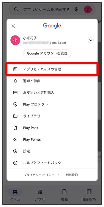 Google Play画面で右上のアカウントアイコンをタップアプリをタップ- アプリによっては、自動更新を許可できないものもあります。