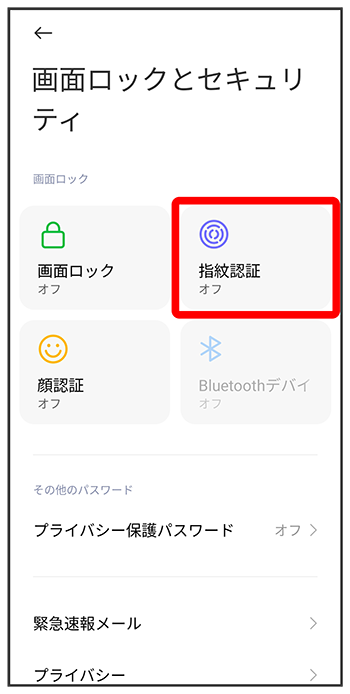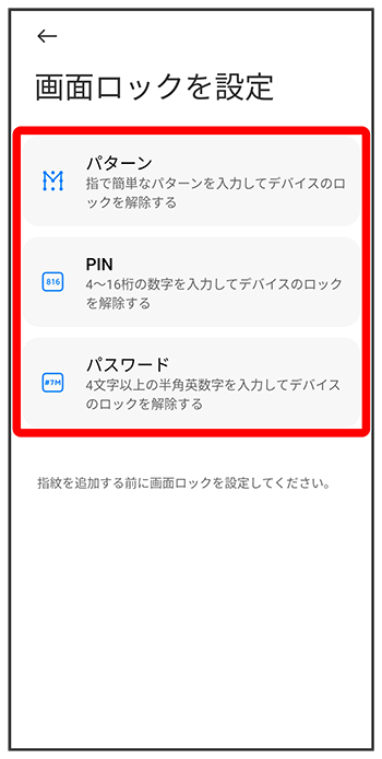 - 指紋認証ができないときの予備の画面ロック解除方法になります。