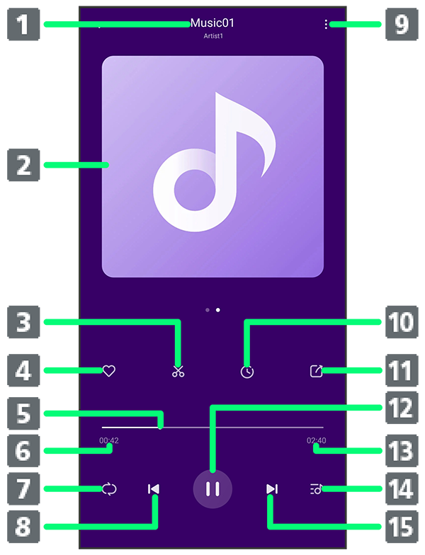 タップすると、1曲リピート/シャッフル/全曲リピートを切り替えできます。 - 前の曲を再生