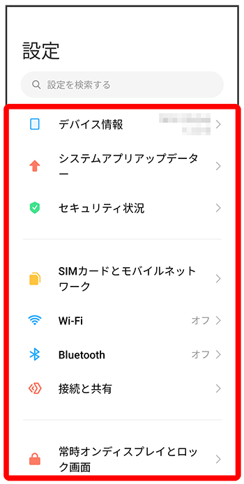 | デバイス情報 | デバイス名や電話番号などを確認することができます。 |