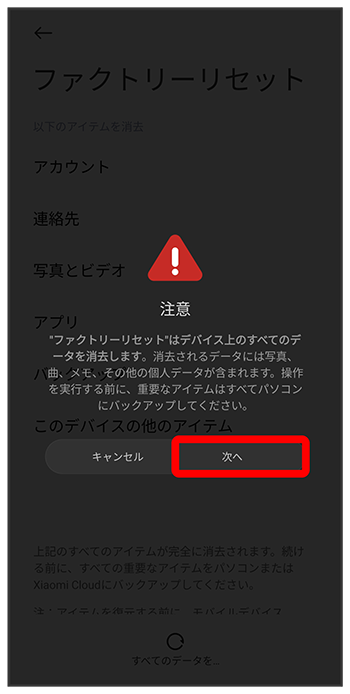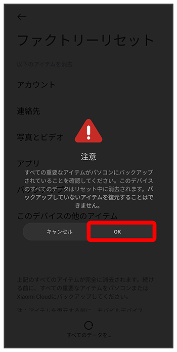 eSIMデータの消去についての画面が表示されます。を選択すると、現在利用しているeSIMが消去されますのでご注意ください。