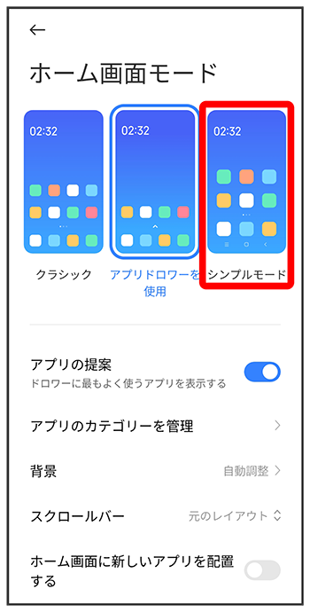 ホーム画面に戻ると、シンプルモードの表示に切り替わります。