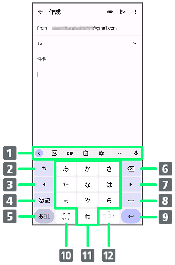 - 文字入力モードを切り替えます(ひらがな/半角英字/数字)。ロングタッチすると入力オプションが表示されます。