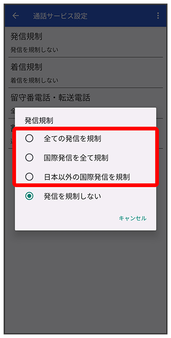 - 発着信規制中に電話やSMSを発信しようとすると、発信できない旨のメッセージが表示されます。お客様がご利用になる地域によっては、表示されるまでに時間がかかることがあります。