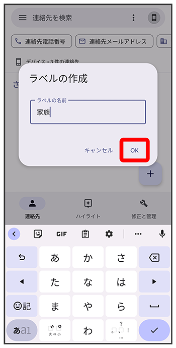 をタップすると、新たに連絡先を登録してラベルに追加できます。
