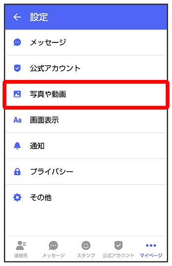 | [モバイルデータ通信時]写真や動画の自動ダウンロード | モバイルデータ通信時に受信した写真や動画を自動でダウンロードするかどうかを設定します。 |