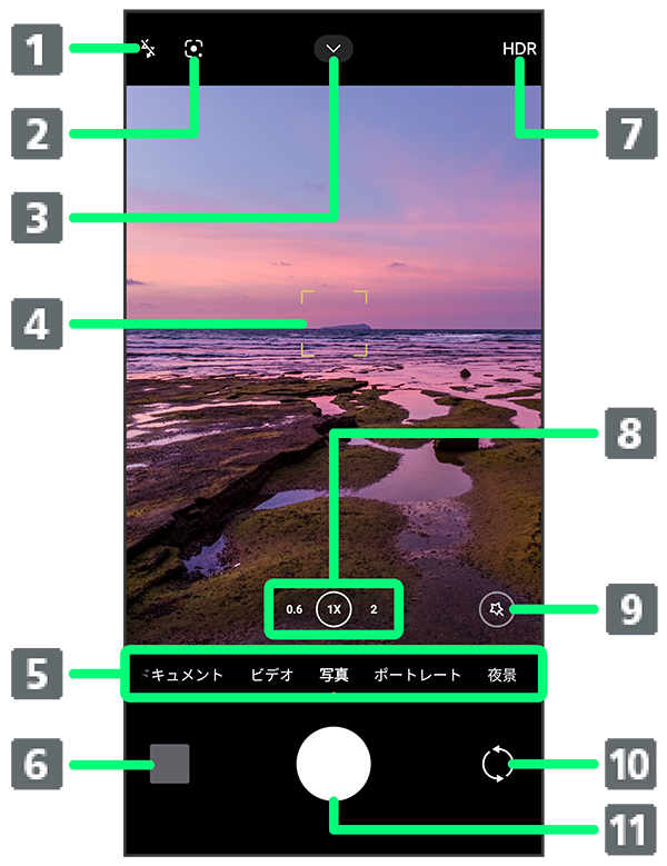 ビューティ/フィルターを設定します。 - リアカメラ/フロントカメラの切り替え