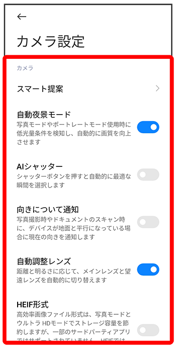 | Xiaomi ProCut | AIで自動的に最適な構図にトリミングするかどうかを設定します。 |
