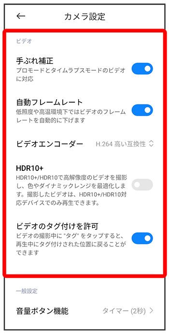 | HDR10+ | HDR10+/HDR10で高解像度のビデオを撮影し、色やダイナミックレンジを最適化するかどうかを設定します。 |