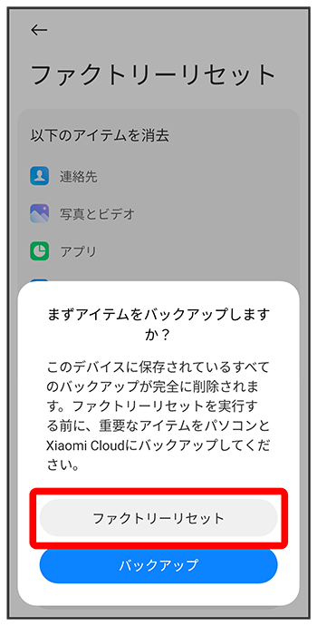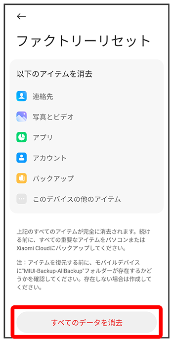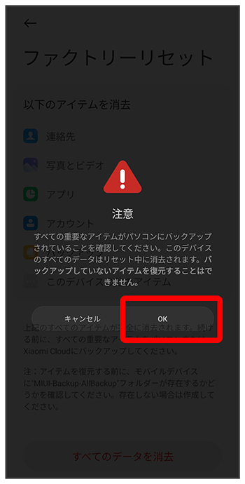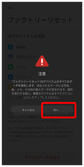 eSIMデータの消去についての画面が表示されます。を選択すると、現在利用しているeSIMが消去されますのでご注意ください。