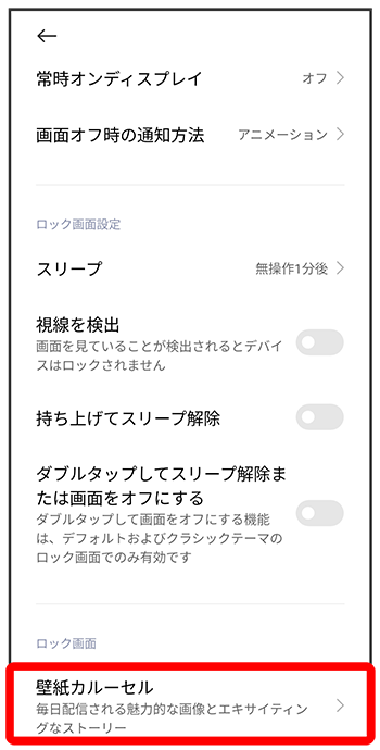 壁紙カルーセル(Glance)を利用して、ロック画面におすすめの壁紙を表示させるかどうかを設定します。