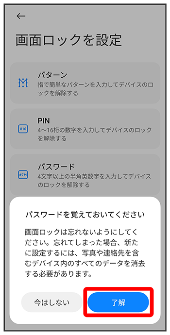 - すでに画面ロック解除方法を設定しているときは、設定が完了します。