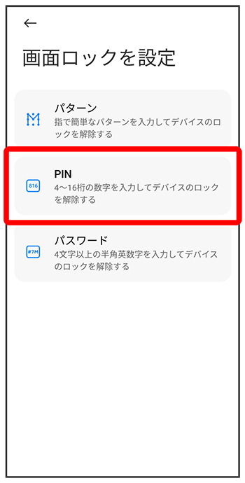 PINで画面ロックを解除するように設定する