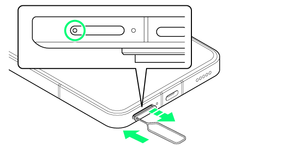 SIM取り出し用ピン(試供品)をトレイ取り出し穴にまっすぐ差し込む
