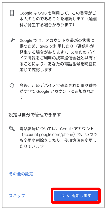 - セキュリティ保護目的でのみ電話番号を追加するときは、をタップします。以降は画面の指示に従って操作してください。