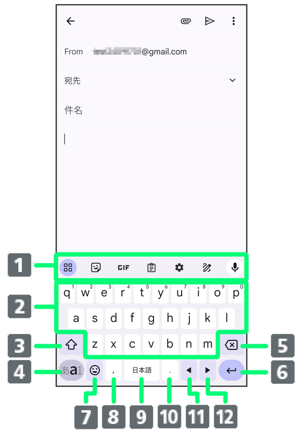 - 文字入力モードを切り替えます(ひらがな/半角英字/数字)。ロングタッチすると入力オプションが表示されます。
