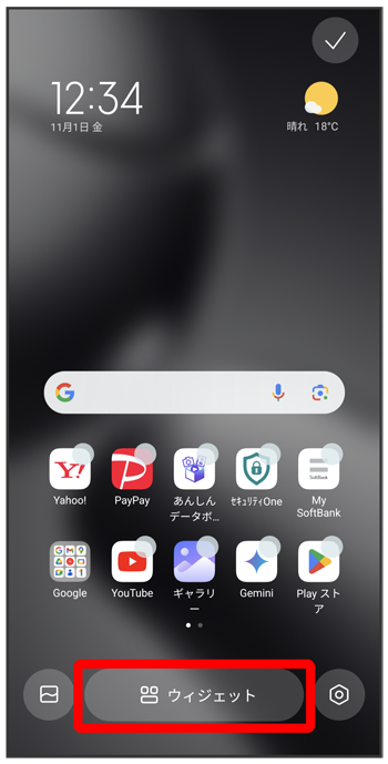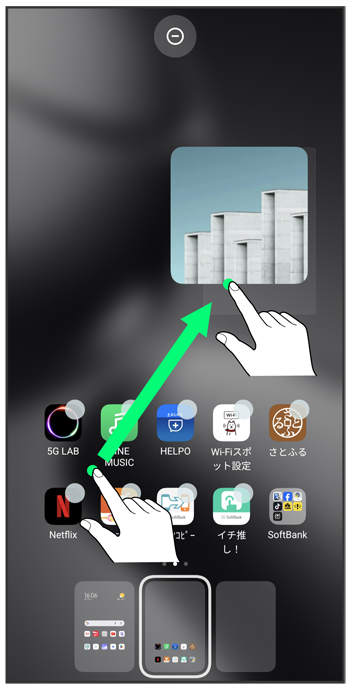 ホーム画面で対象のアイテムをロングタッチ移動したい場所にドラッグウィジェットやアイコンを削除する