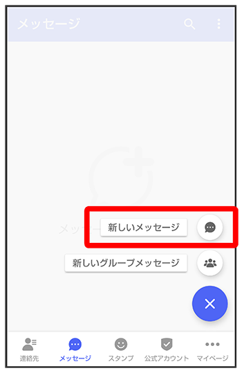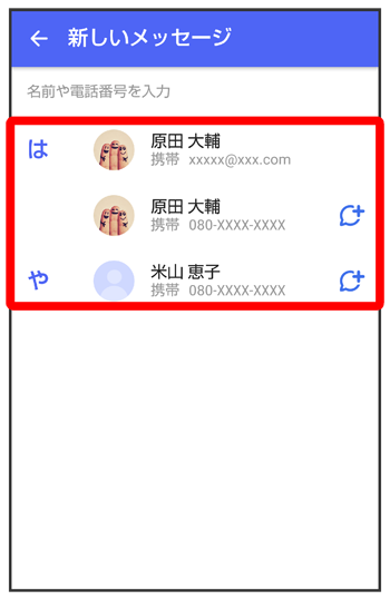 - 連絡先に登録していない電話番号/メールアドレスへ送信する場合は、「名前や電話番号を入力」欄に電話番号/メールアドレスを入力をタップしてメッセージを作成できます。