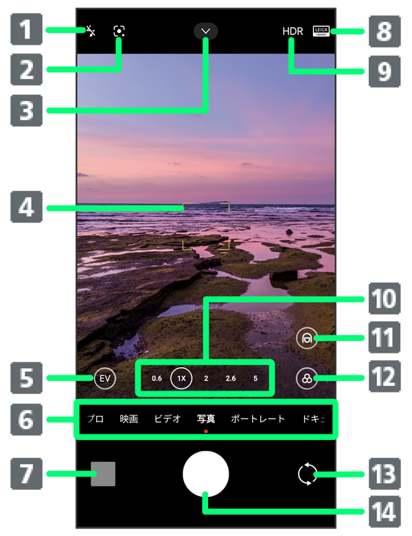 フィルターを設定します。 - リアカメラ/フロントカメラの切り替え