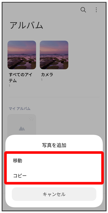アルバム画面で編集したいアルバムをロングタッチ(アルバムに写真/動画を追加する