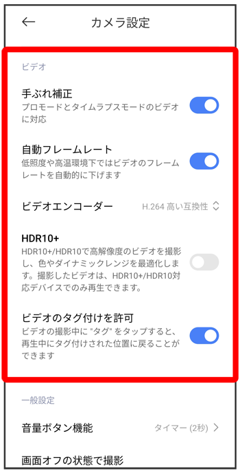 | HDR10+ | HDR10+/HDR10で高解像度のビデオを撮影し、色やダイナミックレンジを最適化するかどうかを設定します。 |
