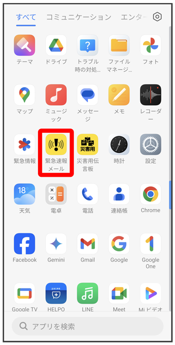 緊急速報メール受信メッセージ一覧画面が表示されます。