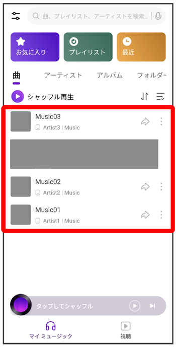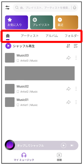 - //をタップすると、アーティスト名/アルバム名/フォルダ名が一覧で表示されます。アーティスト名/アルバム名/フォルダ名をタップしてから、曲名をタップすると曲が再生されます。