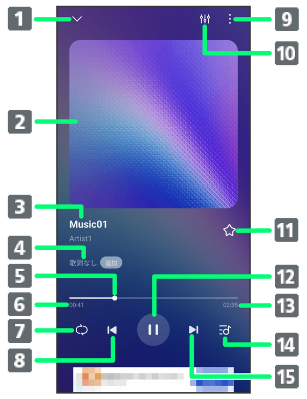 タップすると、歌詞が表示されます。左右にスワイプ/フリックすると前の曲/次の曲が再生されます。 - 曲名/アーティスト名
