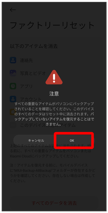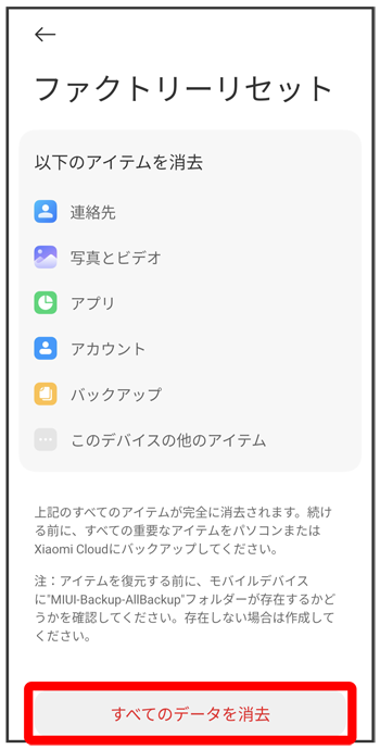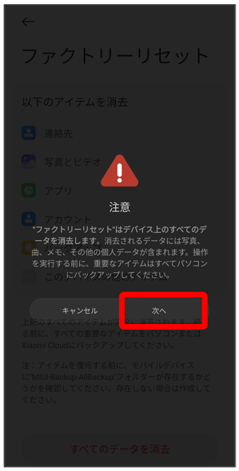 eSIMデータの消去についての画面が表示されます。を選択すると、現在利用しているeSIMが消去されますのでご注意ください。