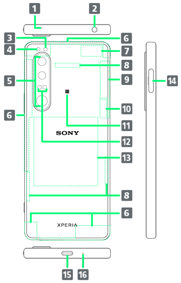 | 5G/4Gアンテナ部/Wi-Fi/GPS/Bluetooth®アンテナ部 | 通話やデータ通信、Wi-Fi、GPS機能、Bluetooth機能を利用する際のアンテナが内蔵されています。 |