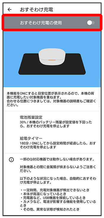 - おすそわけ充電は、Qi対応機器へ充電供給することができます。ただし、すべてのQi対応機器との動作を保証するものではありません。