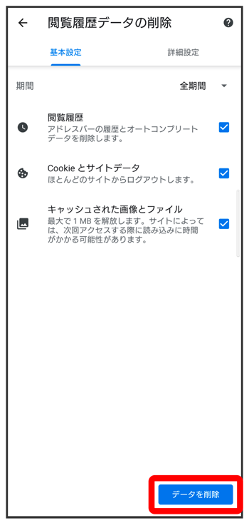 と操作しても閲覧履歴データの削除画面を表示できます。