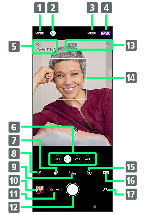 撮影画面で顔や瞳を検出すると、検出した顔や瞳にオートフォーカス枠が表示されます(最大で10個)。そのうち自動でピントを合わせた顔のみ白色の枠で表示されます。他の枠をタップして、ピントを合わせる顔を変更することができます。