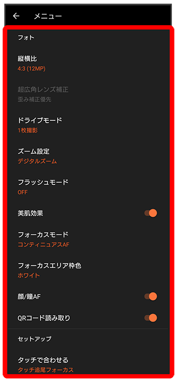 | ドライブモード3 | 写真の撮影方法を設定します。 「1枚撮影」「連続撮影:Hi」「連続撮影:Lo」「セルフタイマー:10秒」「セルフタイマー:3秒」から選択できます。 ・「連続撮影:Hi」は広角レンズのみに対応しています。 ・「連続撮影」に設定した場合は、シャッターアイコンをタッチまたはカメラキーを押し続けている間は連続撮影ができます。 ・「連続撮影:Hi」の場合は最大で200枚まで、「連続撮影:LO」の場合は最大で100枚まで連続撮影ができます。 |