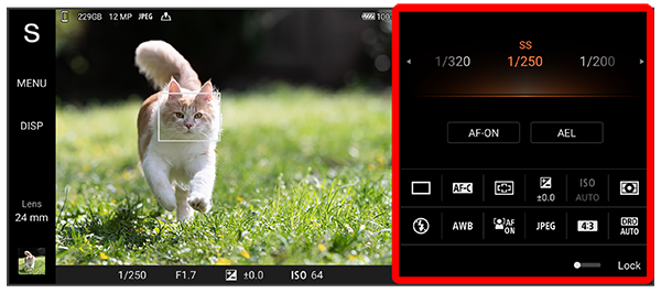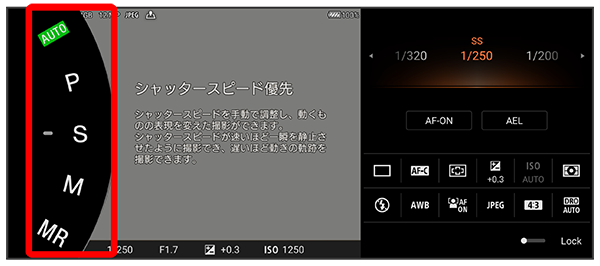 - 「S(シャッタースピード優先)」:シャッタースピードを手動で調整し、動く被写体の表現を変えて撮影できます。Sモードに設定するとISO感度が「AUTO」に設定されます。