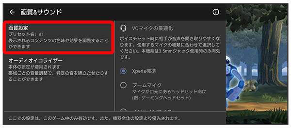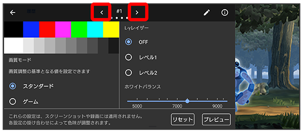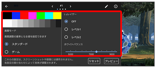 画質設定を4つまでプリセットできます。ゲームの状況に応じてプリセットを選択して、画面の色味や効果を調整することができます。