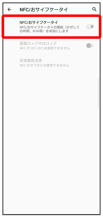 表示)にすると、画面ロック中にNFC/おサイフケータイ®機能がロックされます。画面ロックを解除している間、NFC/おサイフケータイ®機能を利用できます。
