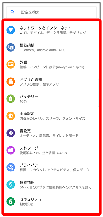 | 機器接続 | Bluetooth接続やNFC/おサイフケータイ®設定など、ほかの機器との接続に関する設定ができます。 |