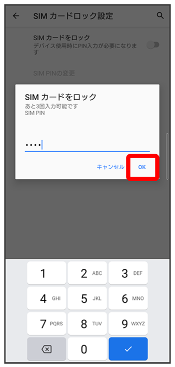 PINコードを有効にすることで、SIMカードを本機に取り付けた状態で電源を入れたとき、PINコードを入力する画面を表示するように設定できます。