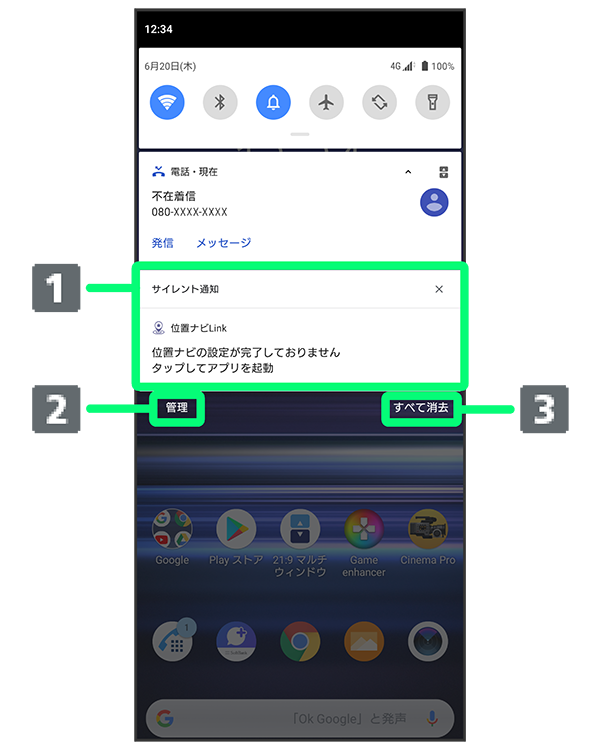 通知パネルでサイレント通知に設定する通知をロングタッチ- サイレント通知をロングタッチと操作すると通常の通知方法に切り替えることができます。