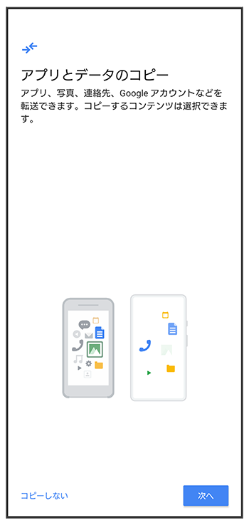 - Google アカウントを設定しているほかの端末からデータをコピーする場合は、をタップして、画面の指示に従って操作してください。