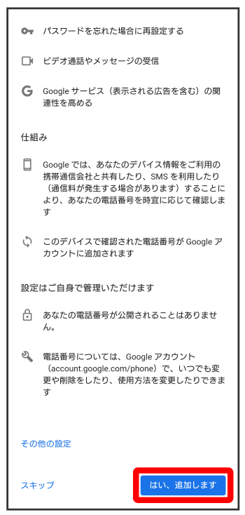 - セキュリティ保護目的でのみ電話番号を追加するときは、をタップします。以降は、画面に従って操作してください。