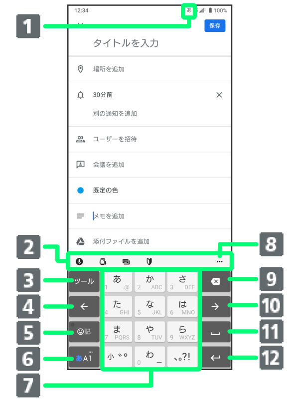 - 文字入力モードを切り替えます(かな/英字/数字)。ロングタッチするとツール一覧を表示します。