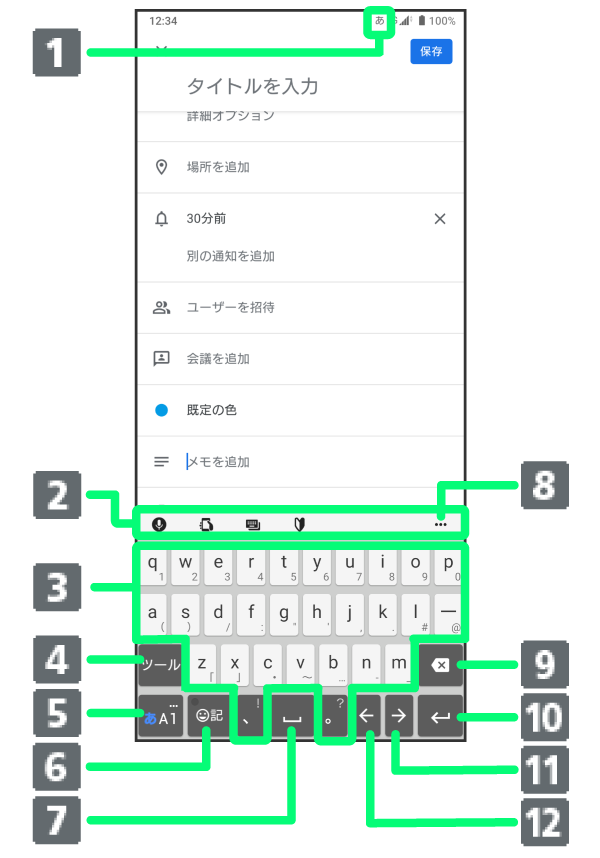 - 現在の文字入力モードが表示されます。