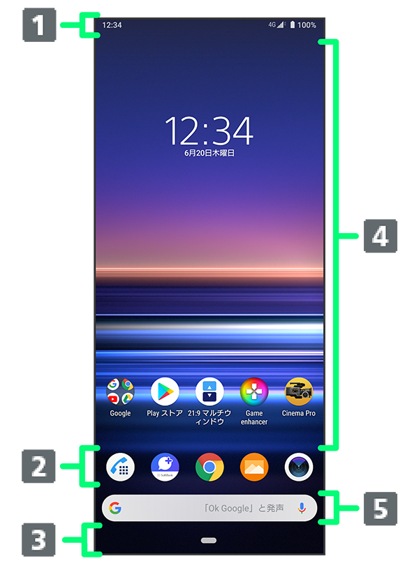 | カスタマイズエリア | アプリのショートカットやフォルダ、ウィジェットを自由に配置できます。 |
