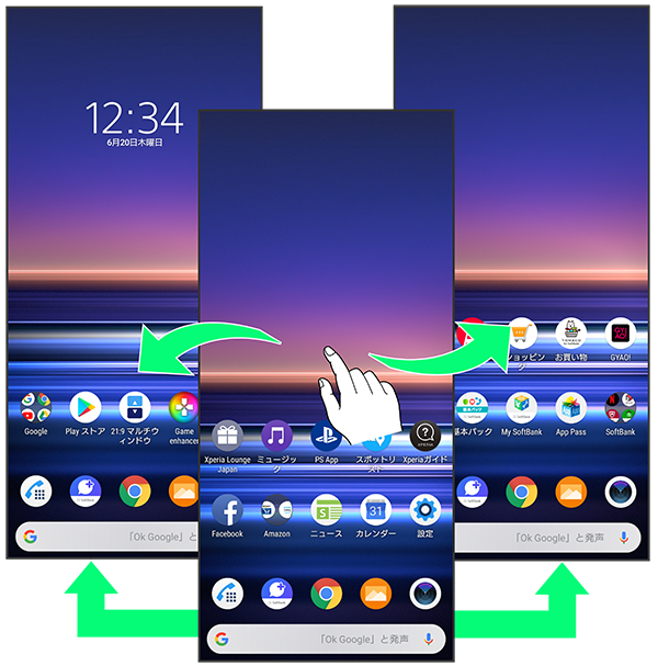 各ホーム画面シートをアプリのショートカットやウィジェットなどでカスタマイズして、便利に使用できます。ホーム画面を左右にフリックすると、ホーム画面シートを切り替えることができます。